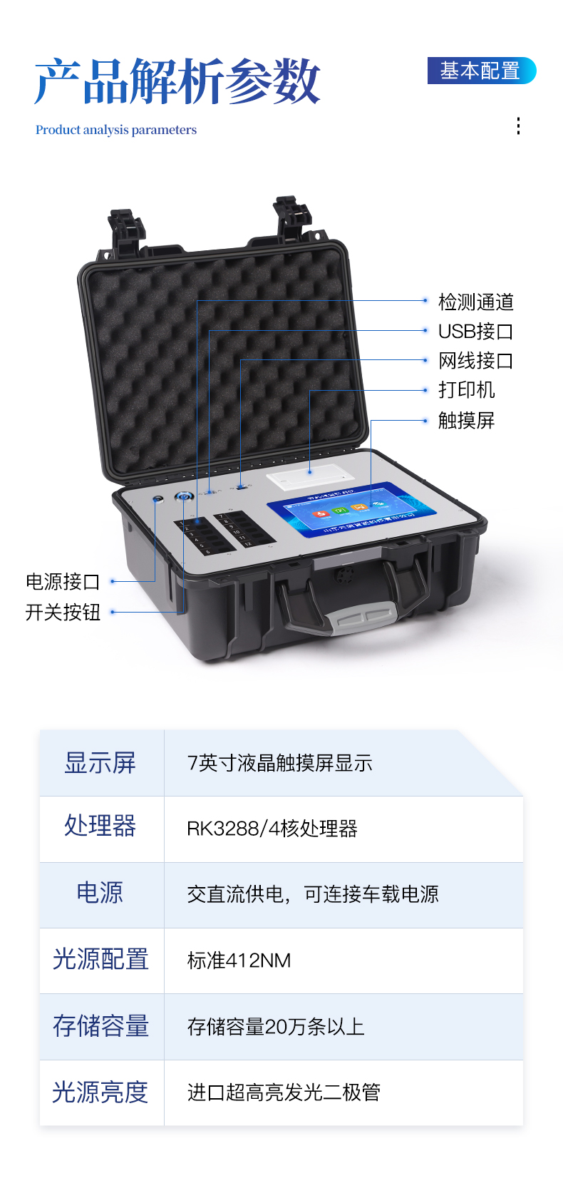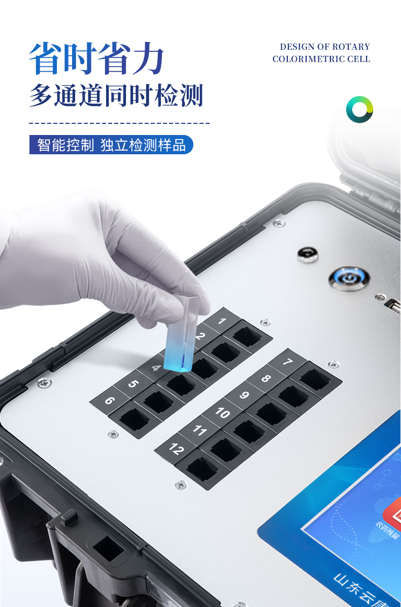 | 主控芯片采用ARM Cortex-A7,RK3288/4核處理器,主頻1.88Ghz,運轉(zhuǎn)速度更快速,穩(wěn)定性更強。 | 12個檢測通道,可批量快速多樣品檢測, | 顯示方式:7英寸液晶觸摸屏顯示,人性化中文操作界面,讀數(shù)直觀、簡單。 | 交直流兩用,配有6ah大容量充電鋰電池,方便戶外流動測試,直流12V供電,可連接車載電源。 | 智能恒流穩(wěn)壓,光強自動調(diào)節(jié)與校準,長時間連續(xù)工作光源無溫漂現(xiàn)象。 | 樣本編號自動累加。 | 數(shù)據(jù)無線上傳平臺,并可從平臺導出為Excel表格。 | 檢測結(jié)果存儲容量20萬條 | 同時支持U盤拷貝,標準USB接口,免驅(qū)動插拔。 | 檢測項目可擴充,固件可升級 | 儀器尺寸:43×35×19cm, 主機凈重:5.2kg |