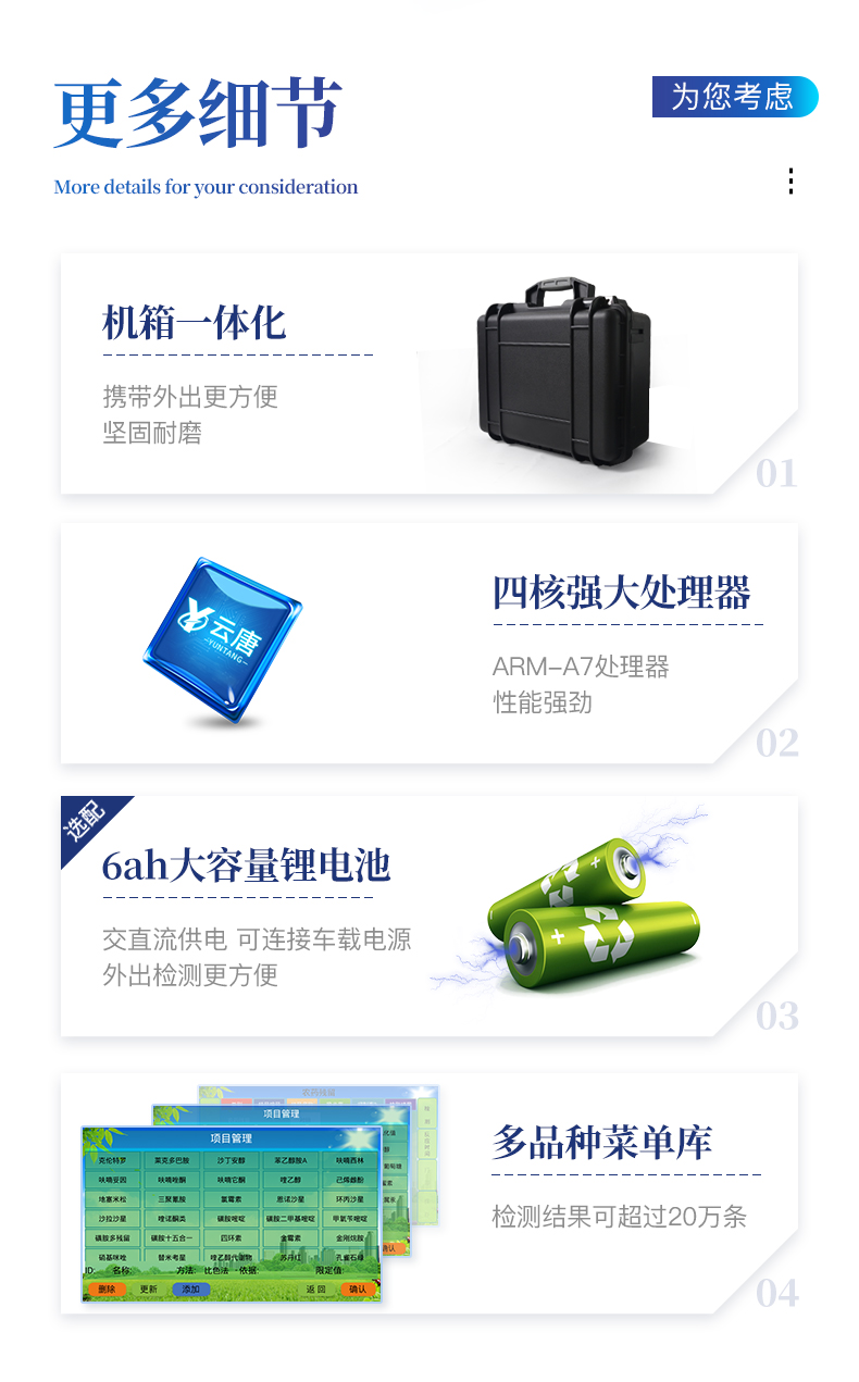 | 機箱采用工業(yè)級ABS工程塑料箱,方便攜帶,穩(wěn)固耐用,便于流動測試。 | 安卓智能操作系統(tǒng),采用更加**的UI交互界面,具有wifi聯(lián)網(wǎng)上傳、4G聯(lián)網(wǎng)傳輸、GPRS無線遠傳、網(wǎng)線連接功能,快速批量上傳數(shù)據(jù)。 | 一體化主機,包含多通道光電檢測模塊、膠體金免疫層析檢測模塊。 | 膠體金模塊檢測方式:軌道式自動傳輸掃描,檢測完成后自動退出檢測卡。 | CT線自動識別,無需手動調(diào)整,檢測完成自動顯示CT坐標曲線。 | 儀器具有自檢功能:具有開機自檢和調(diào)零功能,具有自動檢測重復性功能。 | 新一代高速熱敏打印機,檢測完成可自動打印或批量打印檢測報告和二維碼。 | 儀器帶有監(jiān)管平臺,數(shù)據(jù)可局域網(wǎng)和互聯(lián)網(wǎng)數(shù)據(jù)上傳,檢測結(jié)果直接傳至食品安全監(jiān)管平臺。進行區(qū)域食品安全監(jiān)管及大數(shù)據(jù)分析處理與數(shù)據(jù)統(tǒng)計,檢測區(qū)域農(nóng)產(chǎn)品安全長短期動態(tài),達到食品安全問題預估、預警 | 內(nèi)置強大的數(shù)據(jù)庫,具有多品類多種類樣品菜單功能,可靈活選擇檢測樣品,不同的檢測通道可同時檢測不同的樣品項目。也可在儀器上直接編輯錄入樣品名稱、檢測指標、送檢單位等信息并保存進樣品數(shù)據(jù)庫。 | 產(chǎn)品內(nèi)置操作演示視頻,是您身邊的化驗指導專家。 | 樣品處理簡單省力,整體操作快速、安全、便捷。 | 高靈敏度,高檢測精度,高重復性精度,掃描式高精度光學傳感器。 | 結(jié)果判定線可修改,對照值標定值可保存,斷電不丟失數(shù)據(jù)。 | 兼容市場上所有的膠體金卡,使用耗材不受限制。 | 儀器具有重新校準、鎖定、恢復出廠設(shè)置功能。 |