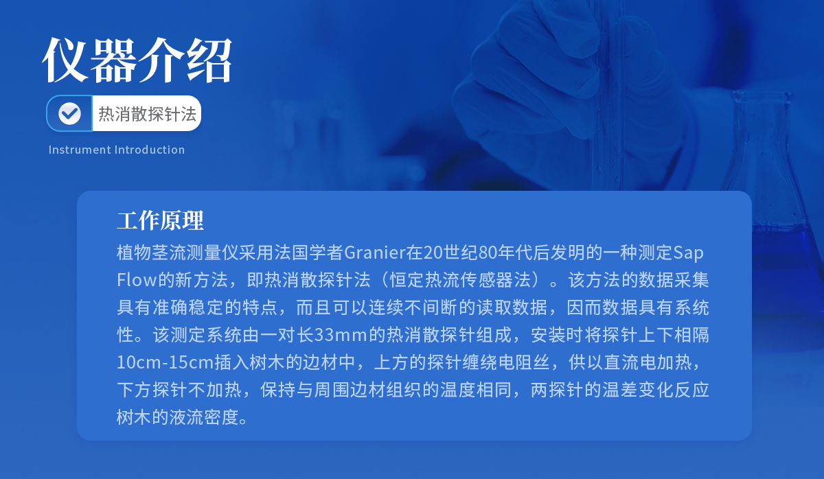 植物莖流測(cè)量?jī)x采用法國學(xué)者Granier在20世紀(jì)80年代后發(fā)明的一種測(cè)定Sap Flow的新方法,即熱消散探針法(恒定熱流傳感器法)。該方法的數(shù)據(jù)采集具有準(zhǔn)確穩(wěn)定的特點(diǎn),而且可以連續(xù)不間斷的讀取數(shù)據(jù),因而數(shù)據(jù)具有系統(tǒng)性。該測(cè)定系統(tǒng)由一對(duì)長(zhǎng)33mm的熱消散探針組成,安裝時(shí)將探針上下相隔10cm-15cm插入樹木的邊材中,上方的探針纏繞電阻絲,供以直流電加熱,下方探針不加熱,保持與周圍邊材組織的溫度相同,兩探針的溫差變化反應(yīng)樹木的液流密度。
