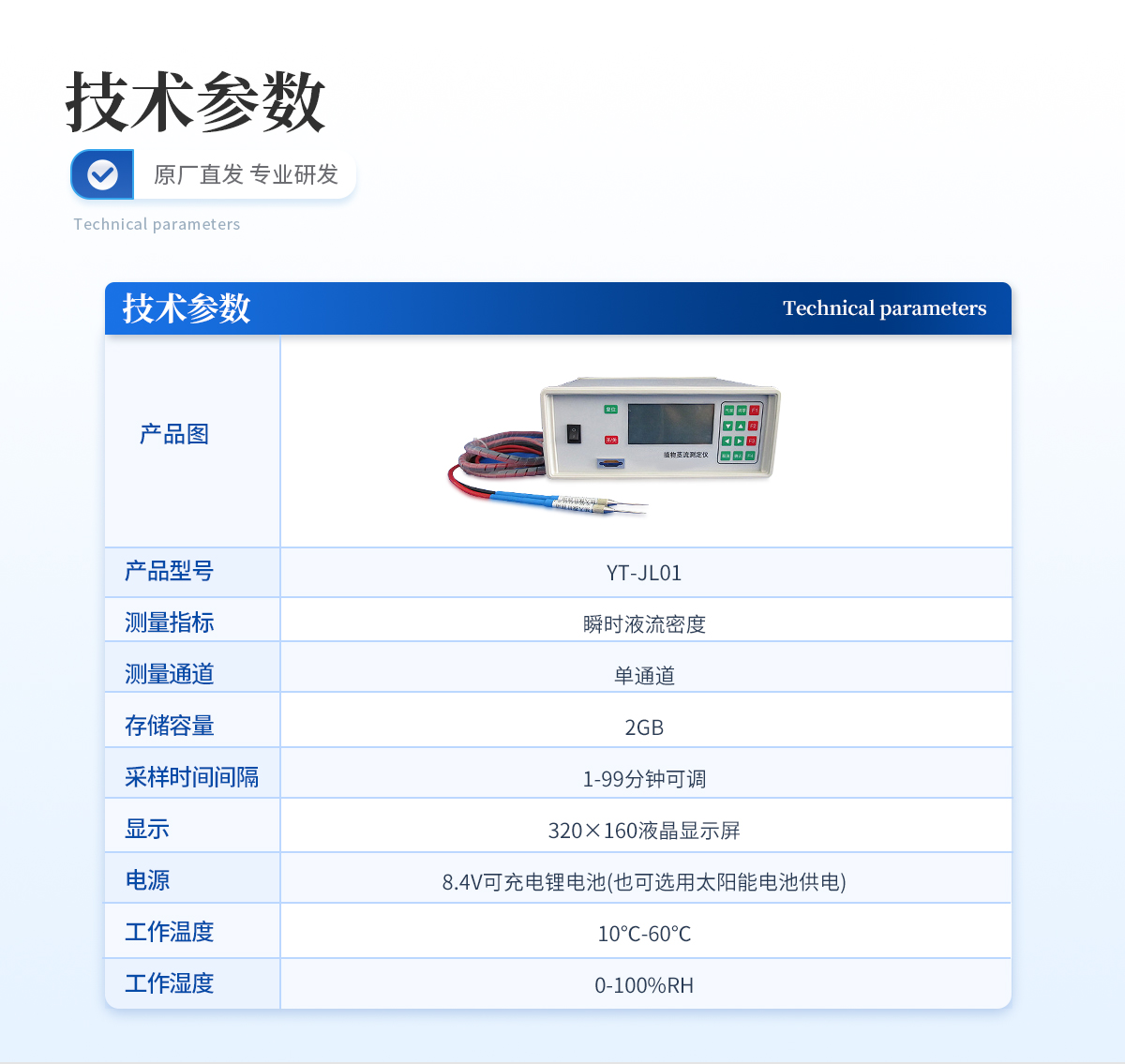 | 測(cè)量指標(biāo):瞬時(shí)液流密度 | 測(cè)量通道:?jiǎn)瓮ǖ?/td> | 存儲(chǔ)容量:2GB | 采樣時(shí)間間隔:1-99分鐘可調(diào) | 顯示:320×160液晶顯示屏 | 電源:8.4V可充電鋰電池(也可選用太陽能電池供電) | 工作溫度:10℃-60℃ | 工作濕度:0-100%RH |