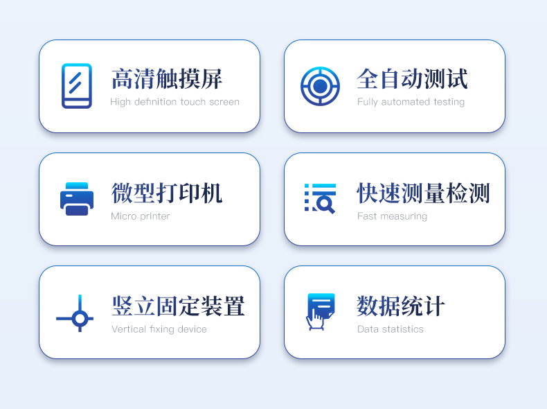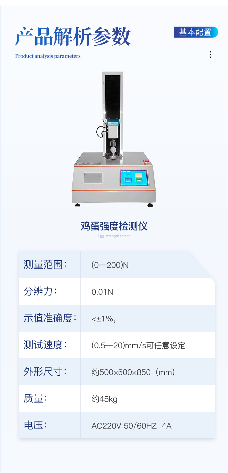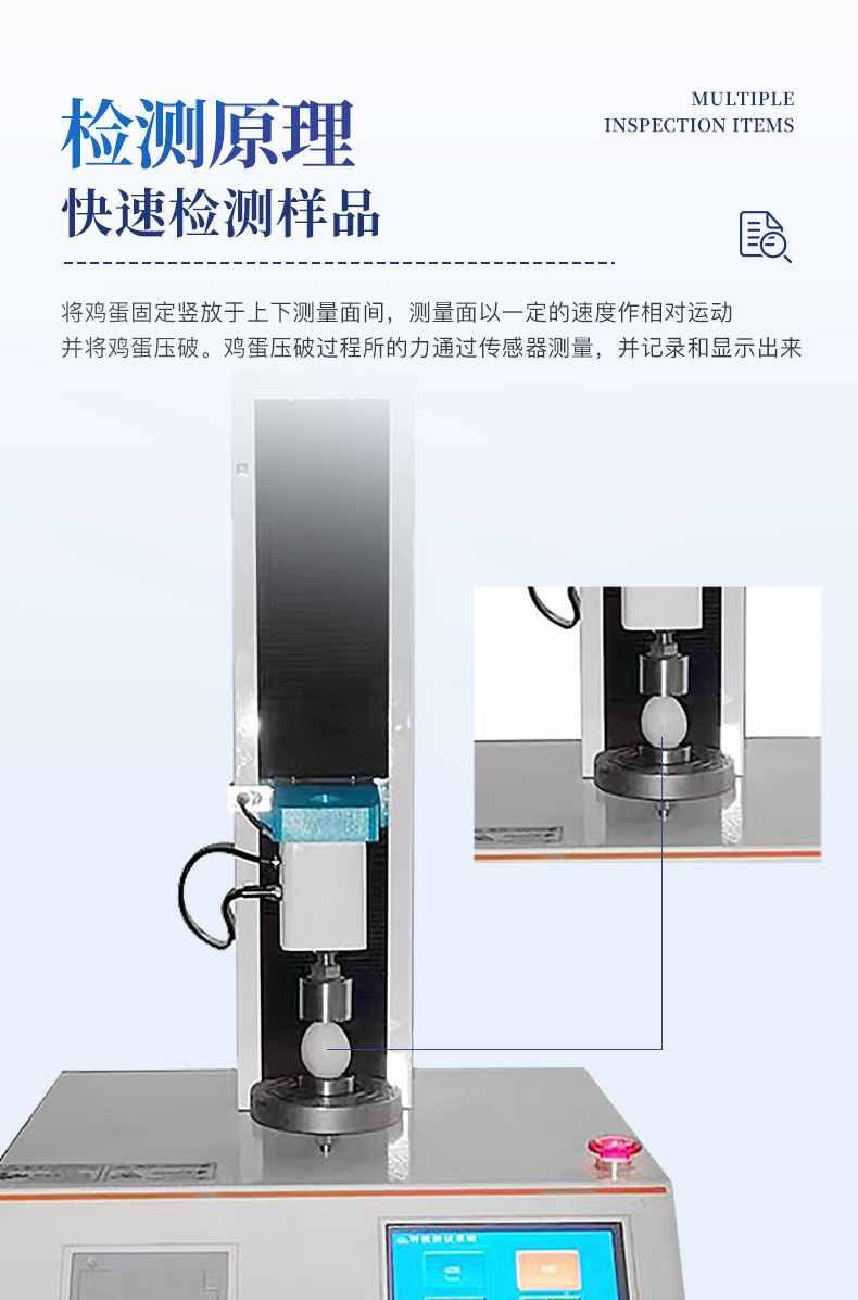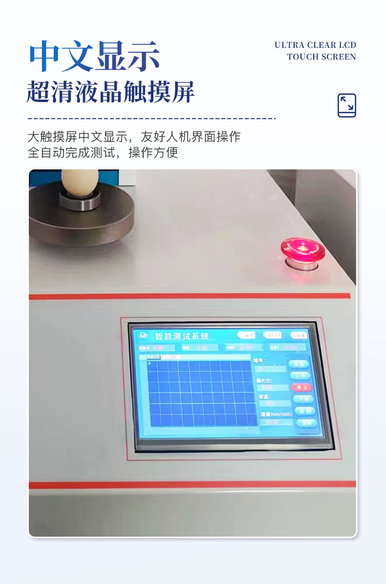 | 1、采用芯片控制,高精度測(cè)力傳感器,精度高。 | 2、采用高性能步進(jìn)電機(jī),精密滾珠絲桿傳動(dòng),保證該儀器傳動(dòng)精準(zhǔn)。 | 3、大觸摸屏中文顯示,友好人機(jī)界面操作。全自動(dòng)完成測(cè)試。操作方便,具有測(cè)試數(shù)據(jù)統(tǒng)計(jì)處理功能,微型打印機(jī)輸出。 | 4、隨機(jī)配備蛋殼豎立固定裝置,方便快速測(cè)量。 |