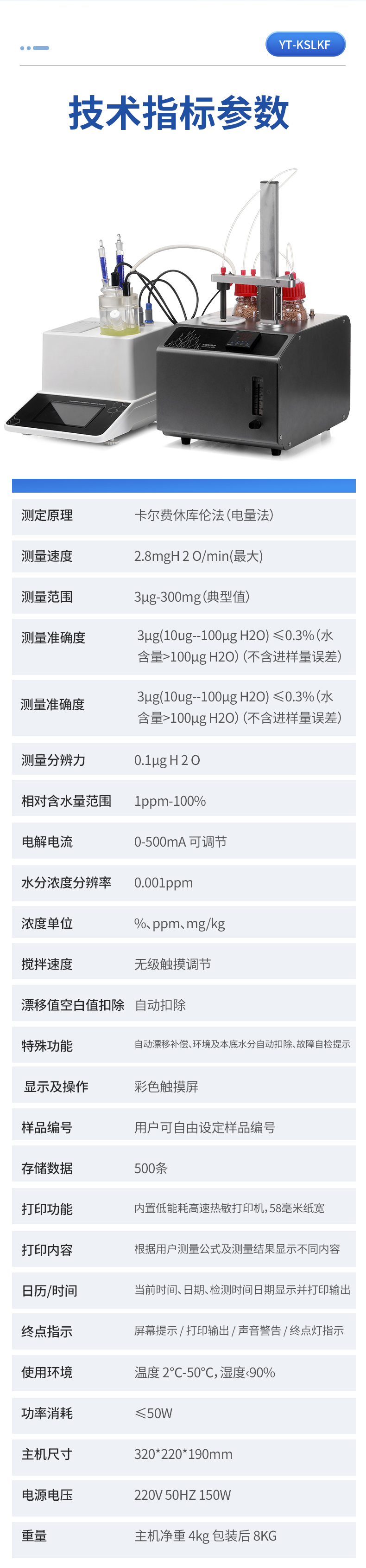 | 1. 測定原理:卡爾費休庫倫法(電量法) | 2. 測量速度:2.8mgH 2 O/min(**) | 3. 測量范圍:3μg-300mg(典型值) | 4. 測量準確度:3μg(10ug--100μg H2O) ≤0.3%(水含量>100μg H2O)(不含進樣量誤差) | 5. 測量準確度:3μg(10ug--100μg H2O) ≤0.3%(水含量>100μg H2O)(不含進樣量誤差) | 6. 測量分辨力:0.1μg H 2 O | 7. 相對含水量范圍:1ppm-100% | 8. 電解電流:0-500mA 可調節 | 9. 水分濃度分辨率:0.001ppm | 10. 濃度單位:%、ppm、mg/kg | 11. 攪拌速度:無級觸摸調節 | 12. 漂移值空白值扣除:自動扣除 | 13. 特殊功能:自動漂移補償、環境及本底水分自動扣除、故障自檢提示 | 14. 顯示及操作:彩色觸摸屏 | 15. 樣品編號:用戶可自由設定樣品編號 | 16. 存儲數據:500條 | 17. 打印功能:內置低能耗高速熱敏打印機,58毫米紙寬 | 18. 打印內容:根據用戶測量公式及測量結果顯示不同內容 | 19. 日歷/時間:當前時間、日期、檢測時間日期顯示并打印輸出 | 20. 終點指示:屏幕提示 / 打印輸出 / 聲音警告 / 終點燈指示 | 21. 使用環境:溫度 2℃-50℃,濕度?90% | 22. 功率消耗:≤50W | 23. 主機尺寸:320*220*190mm | 24. 電源電壓:220V 50HZ 150W | 25. 重量:主機凈重 4kg 包裝后 8KG | 26. 產品名稱:卡氏加熱爐 | 27. 溫控解析:1℃ | 28. 溫控解析:1℃ | 29. 升溫范圍:40-300℃ | 30. 升溫速率:30℃/min (40-200℃) 10℃/min(200-300℃) | 31. 降溫速率:10℃/min | 32. 流量范圍:0-100ml/min(0.1Mpa) | 33. 流量精度:1ml/min | 34. 樣品瓶規格:10ml(5ml、20ml 選配) | 35. 恒溫管路:12V 5W | 36. 載氣輸入接口:3.2mm 耐腐蝕管路 | 37. 載氣系統:外接氣源 | 38. 環境溫度:5-40 攝氏度 | 39. 環境濕度:<65%,濕度越干燥儀器越穩定 | 40. 主機尺寸:320mm*240mm*220mm(不含進樣支架,安裝后高480mm) |