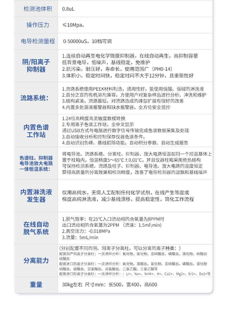 微處理器控制的雙柱塞往復泵,采用**的智能控制算法,能使泵的流量脈動降至**水平。 1.1,材質:鑲嵌式PEEK材料無阻尼泵頭,PEEK管路,適合于pH為0~14的淋洗液及反相有機溶劑。 1.2,流量范圍:0.001~9.999ml/min,增量0.001ml/min。 1.3,流量設定值誤差:≤0.1% 1.4,流量穩定性:≤0.1% 1.5,工作壓力:35MPa 1.6,過壓保護:工作壓力超過或低于設定的上限或下限時,泵將自行關閉且報警。 | 2 電導檢測器: 2.1,原理:五極電導檢測器 2.2,電極材料:鈍化316L不銹鋼 2.3,基線噪音:≤0.002μS/cm 2.4,基線漂移:≤0.008μS/cm·30min 2.5,zui小檢出濃度:≤0.0005ug/mL(以Cl-計) 2.6,儀器線性:≥0.9995 2.7,定量重復性:≤0.1%(以Cl-計) 2.8,定性重復性:≤0.1%(以Cl-計) 2.9,測量范圍:0~50000us/cm 2.10,分辨率:≤0.0020ns/cm 2.11,檢測池體積:0.8uL 2.12,操作壓力:≤10Mpa。 2.13,電導檢測量程: 0-50000uS,10檔可調。 | 3、 陰、陽離子抑制器: 3.1連續自動再生電化學微膜抑制器,在線自動再生,高抑制容量,低背景電導,低噪聲,基線穩定,免維護。 3.2抗污染,耐壓好,壽命長,使用范圍廣(PH0-14)。 3.3體積小,穩定時間快,穩定時間不大于12分鐘,且重現性好。 | 4 流路系統: 4.1流路系統使用PEEK材料制造,通用性好,能使用強酸、強堿的淋洗液。 4.2百分之百的有機溶劑兼容,方便用戶對復雜樣品進行分析、沖洗和維護。 4.3 結構緊湊,流路*短,對流路造成的峰型擴展有很好的改善。 4.4 內置多處漏液報警器和缺水報警器,全方位安全監控。 | 5 內置色譜工作站: 5.1 24位高精度高靈敏度數模轉換。 5.2專用離子色譜工作站,全中文顯示,通過USB方式與電腦進行數字信號傳輸,完成色譜數據采集及處理。 5.3自動接收分析和控制保存儀器色譜條件。 5.4自動識別負峰、基線扣除功能。自動積分參數、自動生成報告。 | 6 色譜柱、抑制器、電導池、放大電路一體恒溫系統: 將電導池、流路系統、分離柱、抑制器、放大電路恒溫在同一個控溫基體上置于柱箱內,恒溫精度5~65℃±0.01℃。并且儀器柱箱采用絕熱結構,可保持檢測系統、流路及柱子、抑制器、電導池、放大電路的溫度恒定,獲得高質量的分離效果和檢測精度,改善了電導檢測器的溫飄和基線噪聲。 | 7內置淋洗液發生器,僅用高純水,無需人工配制任何化學試劑,在線產生等度或梯度高純淋洗液,減少基線漂移,提高穩定性,簡化工作流程。 | 8 在線自動脫氣系統: 1,脫氣效率:在25℃入口流動相的含氧量為8PPM時,出口流動相的含氧量為2PPM (流速:1.5mlmin) 2,真空壓力:-0.018MPa 3,流量:5mL/min | 9 分離能力:(分別配置不同的陰、陽離子分離柱,可以分離的離子種類:) 配置國產陰離子分離柱:一次進樣分析:氟化物、氯化物、亞硝酸鹽、磷酸鹽、溴化物、硝酸鹽、硫酸鹽 配置進口陰離子分離柱:一次進樣分析:氟化物、溴酸鹽、氯化物、亞硝酸鹽、磷酸鹽、溴化物、硝酸鹽、硫酸鹽、亞氯酸鹽、高氯酸鹽、二氯乙酸、三氯乙酸等 配置進口陽離子分離柱:一次進樣分析::Li+、Na+、NH4+、K+、Ca2+、Mg2+、Sr2+、Ba2+等 | 10 重量:30kg左右 尺寸mm:長500,寬400,高600 |