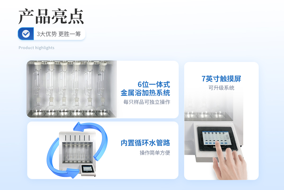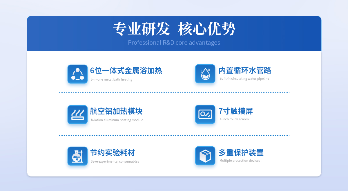 | 1.7英寸大液晶觸摸屏顯示控制,可升級程序控溫和遠程操作系統(tǒng) | 2.6位一體式金屬浴加熱系統(tǒng),保證每只樣品可獨立操作 | 3.航空鋁加熱模塊,升溫速度快,回流速度快,大大縮短提取時間 | 4.進口溫度傳感器,控溫精度高,均勻性好 | 5.自帶加熱萃取、淋洗溶劑回收功能,大大節(jié)約實驗耗材 | 6.內(nèi)置循環(huán)水管路,操作簡單方便(可升級為內(nèi)置冷卻裝置) | 7.具有過壓,過熱,漏電多重保護裝置,無需看管,保證機器長時間使用的安全性 | 8.可升級成內(nèi)置冷水系統(tǒng),無需外接水源。具有計時和時間控制的循環(huán)系統(tǒng);冷卻水全自動控制。 |