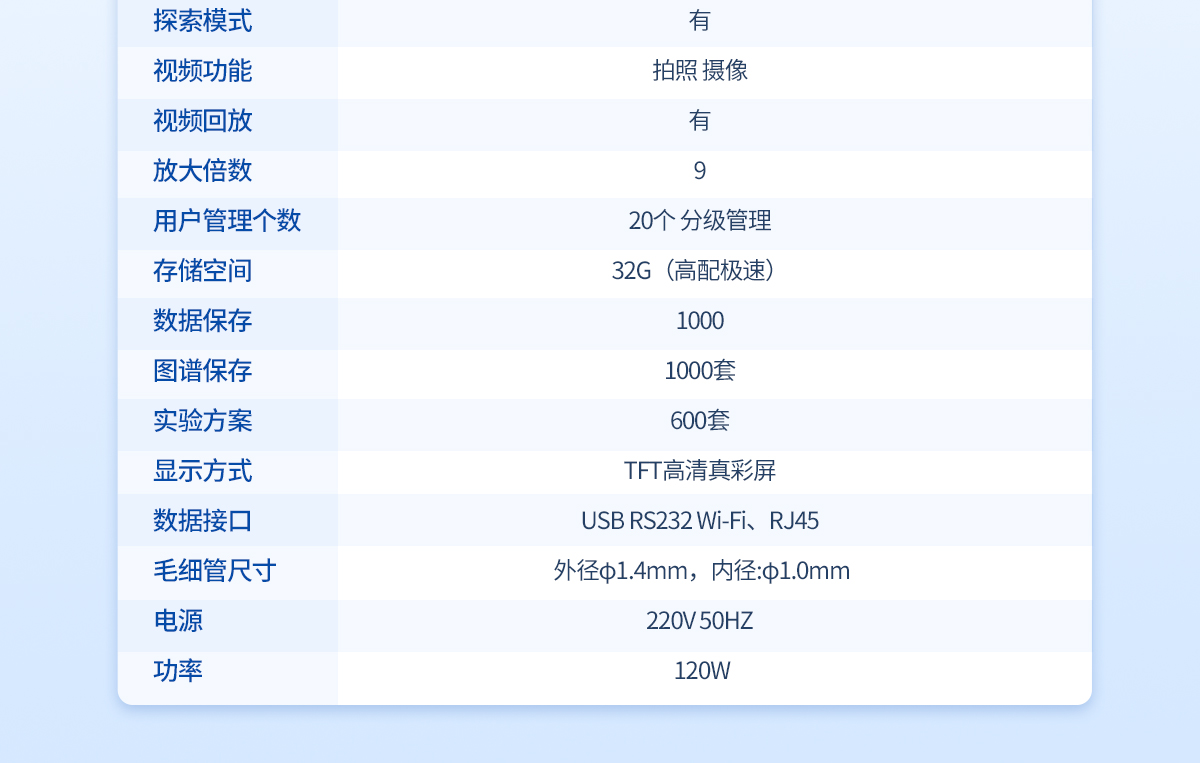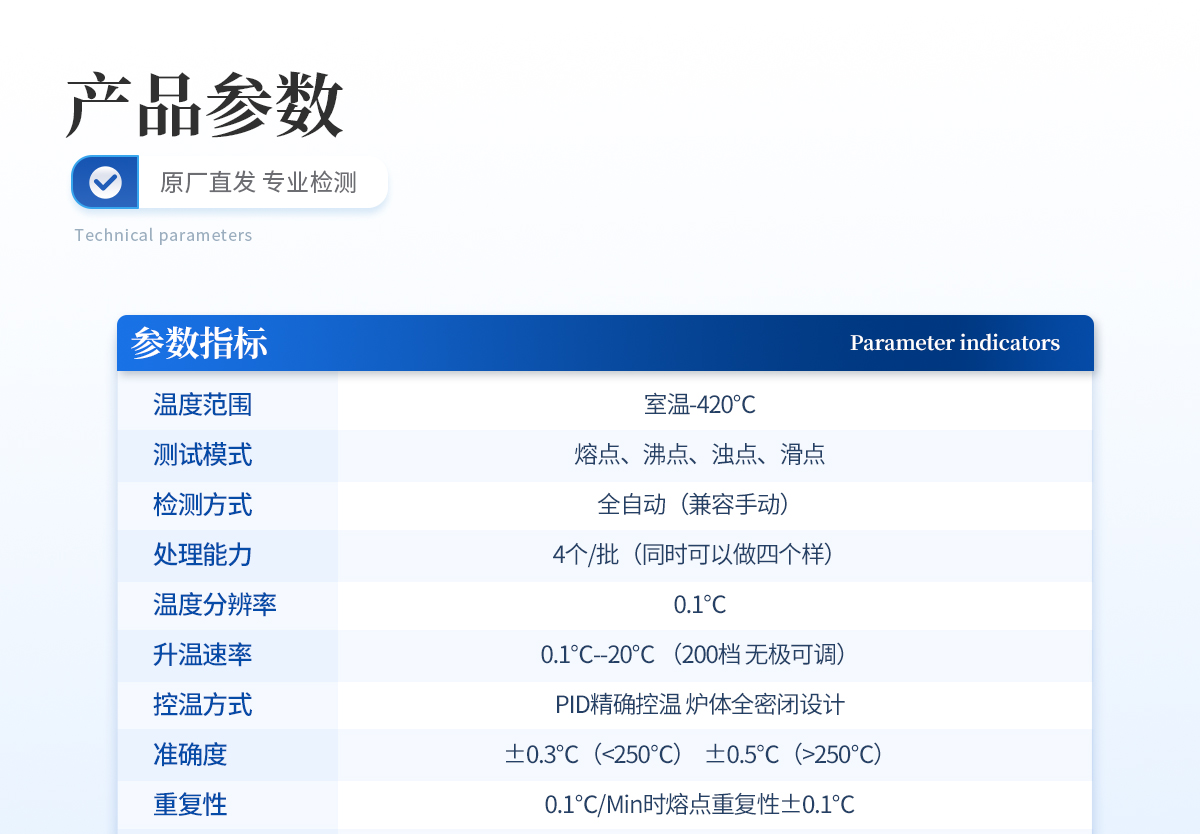 溫度范圍:   室溫-350℃檢測方式:   半自動/手動處理能力:   4個/批(同時可以做四個樣)判斷能力:   視頻目視溫度分辨率:0.1℃升溫速率:   0.1℃--20℃ (200檔 無極可調)控溫方式:   PID**控溫 爐體全密閉設計加熱方式:   傳導液加熱法或者電熱塊空氣加熱法(選配)升溫分辨率:0.1℃升溫速率:   0.1℃/Min-:20℃/Min準確度:       ±0.3℃(<200℃),±0.5℃(>200℃)重復性:       0.1℃/Min時熔點重復性±0.1℃校正功能:   具備探索模式:   有視頻回放:   有/有時間水印高清攝像頭:觀察樣品熔融狀態放大倍數:   ≥10用戶管理個數:30個以上 分級三級管理存儲空間:   32G硬盤,≥2G內存試驗方法:   有數據保存:   32G圖譜保存:   200內存擴展:   可以實驗方法儲存量:50套審計追蹤:   有網 絡:         無線WIFI顯示方式:   8寸高清彩屏數據接口:   USB,網絡WiFi接口,RS232數據真實性:防篡改功能數據導出:   可用U盤導出數據輸出形式:PDF格式和EXCL數據數據溢出提醒:提前自動提醒打印機:       選配激光打印機或熱敏/針式(兼容)毛細管尺寸:外徑φ1.4mm,內徑:φ1.0mm電源:220V 50HZ      功率:120W