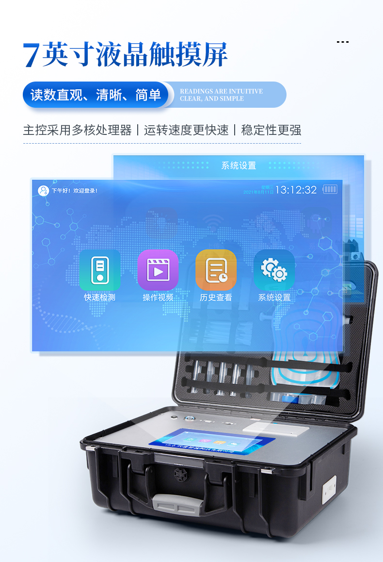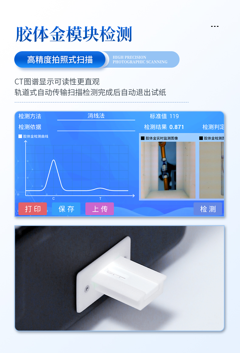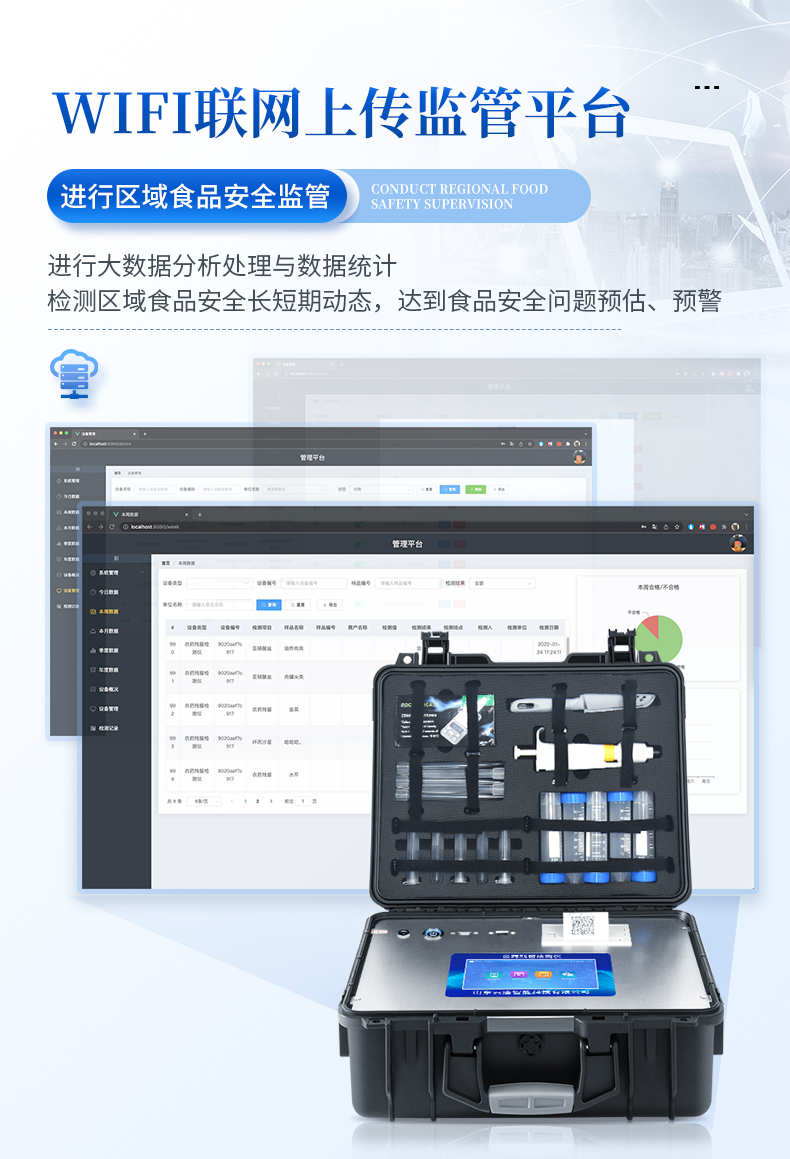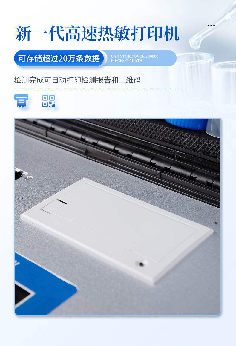 | 安卓智能操作系統,采用更加**UI交互界面,儀器具有wifi聯網上傳、4G聯網傳輸、GPRS無線遠傳、網線連接功能,快速批量上傳數據。 | 智能化程度高,儀器具有自檢功能:具有開機自檢和調零功能,具有自動檢測重復性功能。 | 新一代高速熱敏打印機,檢測完成可自動打印檢測報告和二維碼。 | 儀器帶有監管平臺,數據可局域網和互聯網數據上傳,檢測結果直接傳至食品安全監管平臺。進行區域食品安全監管及大數據分析處理與數據統計,檢測區域食品安全長短期動態,達到食品安全問題預估、預警 | 一體化便攜式快檢設備,滿足現場及流動檢測使用需求,能夠在同一軟件下實現所有檢測項目的檢測,并可通過同一窗口直觀顯示檢測結果。 | 膠體金模塊檢測方式:軌道式自動傳輸掃描,檢測完成后自動退出檢測卡。 | 一體化主機,包含食品安全檢測模塊、多通道農藥殘留檢測模塊、膠體金免疫層析檢測模塊。 | CT線自動識別,無需手動調整。 | 儀器具有品類多種類樣品菜單庫,可靈活選擇檢測樣品,不同的檢測通道可同時檢測不同的樣品項目。。 | 樣品處理簡單省力,整體操作快速、安全、便捷。 | 儀器具有自身保護功能,可設置用戶名及密碼,防止非工作人員操作等。 | 高靈敏度,高檢測精度,高重復性精度,掃描式高精度光學傳感器。 | 儀器具有重新校準、鎖定、恢復出廠設置功能。 | 內置強大的數據庫,可在儀器上直接選擇樣品名稱、檢測指標、送檢單位等信息,也可在儀器上直接編輯錄入樣品名稱、檢測指標、送檢單位等信息并保存進樣品數據庫。 | 儀器具有重新校準、鎖定、恢復出廠設置功能。 | 結果判定線可修改,對照值標定值可保存,斷電不丟失數據。 | 兼容市場上所有的膠體金卡,使用耗材不受限制,極大增強用戶使用體驗。 |