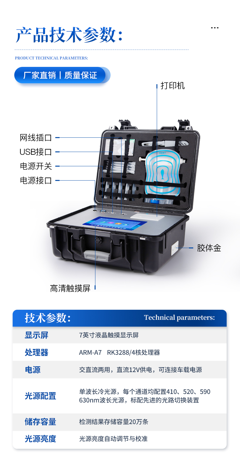 | 主控芯片采用ARM Cortex-A7,RK3288/4核處理器,主頻1.88Ghz,運轉速度更快速,穩定性更強。 | 顯示方式:7英寸液晶觸摸屏顯示,人性化中文操作界面,讀數直觀、簡單。 | 交直流兩用,直流12V供電,可連接車載電源,可配6ah大容量充電鋰電池,方便戶外流動測試。 | 四波長冷光源,每個通道均配置410、520、590、630nm波長光源,標配**的光路切換裝置,專利光路切換功能可實現*多64波長,并且所有檢測項目可實現所有通道同時檢測。 | 光源亮度自動調節與校準 | 智能恒流穩壓,光強自動校準,長時間連續工作光源無溫漂現象。 | 內置新國家限量標準,與所測結果進行現場比對,并持續更新標準。 | 不間斷進樣,連續檢測 | 樣本編號自動累加。 | 數據無線上傳平臺,并可從平臺導出為Excel表格。 | 檢測結果存儲容量20萬條 | 同時支持U盤拷貝,標準USB接口,免驅動插拔。 | 檢測項目可擴充,固件可升級 | 儀器尺寸:43×35×20cm, 主機凈重:5.2kg |
