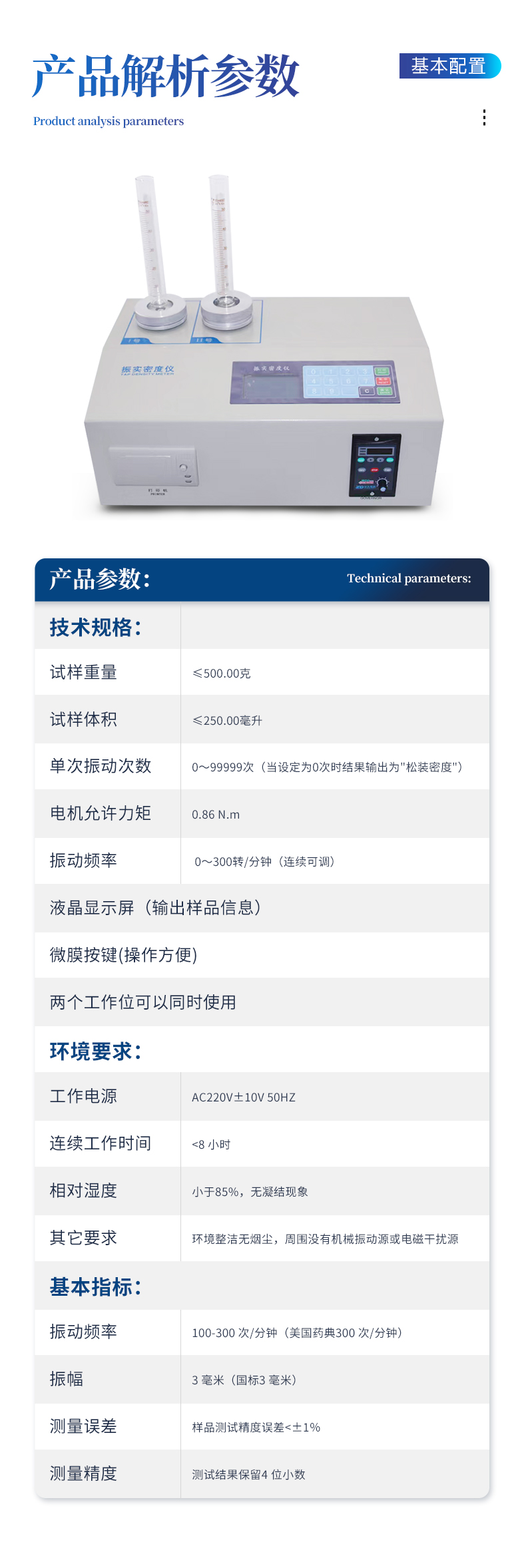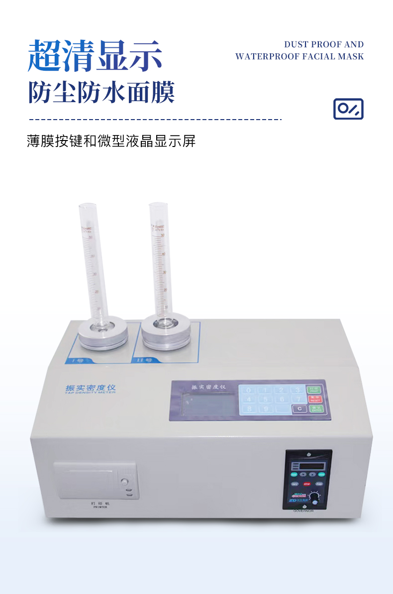 | 試樣重量:≤500.00克; | 試樣體積:≤250.00毫升; | 單次振動次數:0~99999次(當設定為0次時結果輸出為"松裝密度"); | 電機允許力矩:0.86 N.m; | 振動頻率: 0~300轉/分鐘(連續可調); | 液晶顯示屏(輸出樣品信息); | 微膜按鍵(操作方便) | 兩個工作位可以同時使用 | 振動幅度:3mm,(可調) | ZS2高精度振實密度儀是專門針對固體粉體密度的測量儀器,按照****GB/T 5162-2006/ISO3953:1993,參照美國藥典標準研發制造。廣泛應用于工業、電池材料、藥品材料、奶制品、磨料、造紙、水泥、涂料、科研機構、大中專院校以及各種金屬和非金屬行業。 |