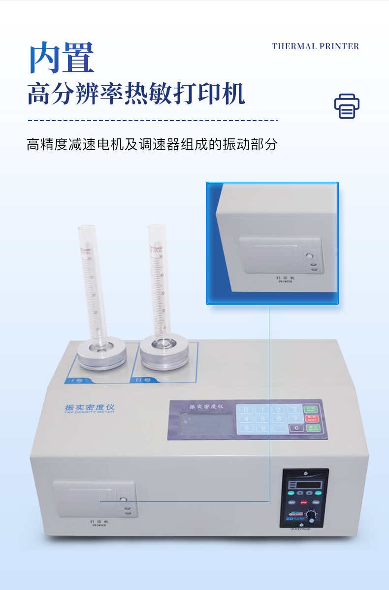 | YT-ZS2型粉體密度測試儀是由丹東市恒瑞儀器有限公司依據標準GB/T 5162-2006/ISO3953:1993(金屬粉末 振實密度的測定),并參照美國藥典獨立研發制造的粉體密度測試儀器,具有自主知識產權。儀器含蓋準備GB/T 5162-2006/ISO3953:1993中的各項指標。 | YT-ZS2型粉體密度測試儀由可調速電機、振動組件、微電腦和微型打印機等部件組成。且儀器具有結構緊湊、牢固,操作簡單等特點。 |